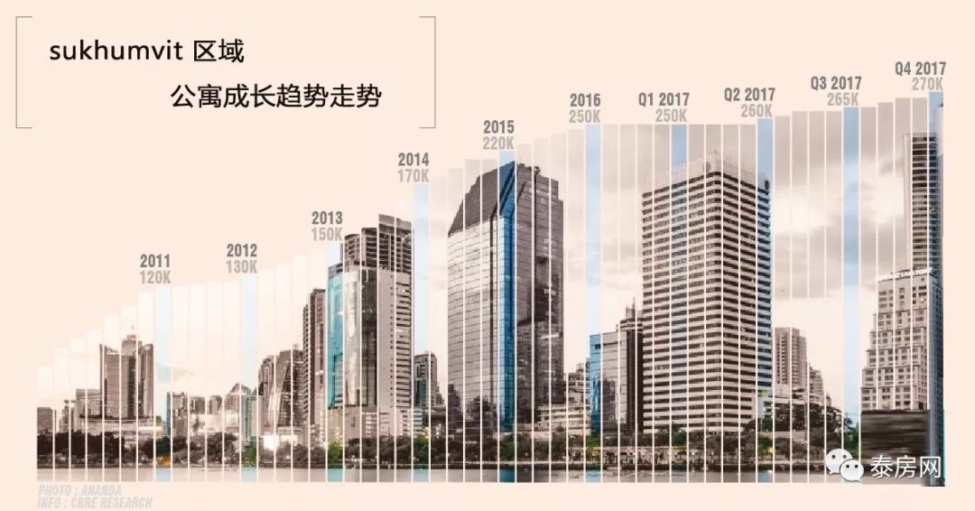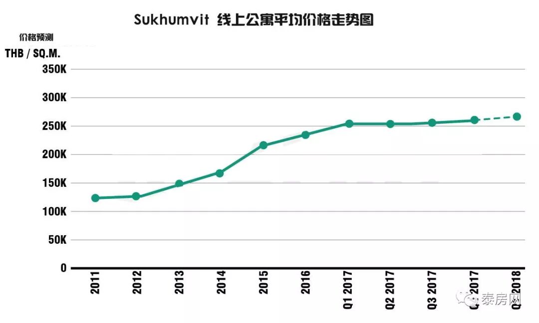 在2014年至2017年期間,圖表從3年內的150,000泰銖/平方米躍升至250,000泰銖/平方米,並且素坤逸(sukhumvit)線上的公寓市場趨勢在今後的幾年內將會持續增長,平均地價也一年比一年更高。預計在今年2018年,曼谷的公寓價格將上漲260,000泰銖/平方米至280,000泰銖/平方米,再加上,隨著曼谷新公寓矮層公寓與高端樓盤的不斷開發,素坤逸(sukhumvit)更多的小巷以及主路和軌道沿線的土地開發量開始正在整體的下降。