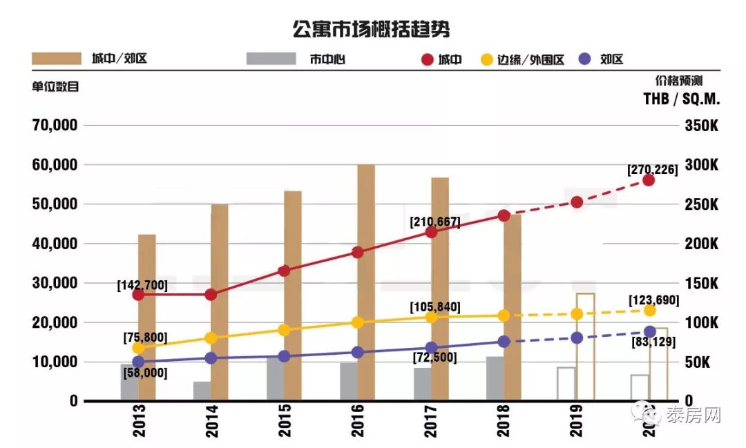 對於曼谷新盤開發量來說,每年開發的數量都會有類似的增長比例,一直到2016年,曼谷的公寓新盤開發量是幾年來的最高比例,且在2016年時候,也是泰國十年來成交歷史第二新高。但在市中心項目開發的比例如今低於城中或外圍,由於沿著軌道交通有相當多的土地,因為高價格和土地的稀缺,如今更多的投資者將目光轉向軌道規劃中的區域,即將準備選擇一個更好的長遠的投資機會。