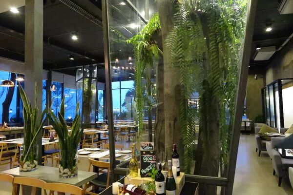 挑高寬敞的室內區,有著大片的玻璃帷幕,因此即使是在室內用餐,也能夠看到餐廳的無敵海景。此外,餐廳仔細且完整的保存了所在位置原本就存在的樹木,並放置了許多綠色植物為擺設,為整個室內空間添加了不少清新舒適感。