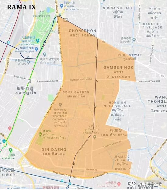 Rama 9大道,東止於機場快速入口,中間腹地橫跨與曼谷素坤逸區相連,可以輕鬆出入曼谷各個角落。
