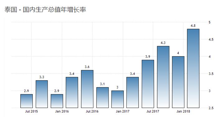 泰國的政局非常穩定,在“一帶一路”戰略下,與中國的關係也固若金湯,唯一讓人牽掛的就是泰國的經濟形勢。最新公佈的數據中,泰國GDP年度增長率達到了4.8%,跟2015年、2016年相比,泰國的經濟無疑是上了新的台階。
